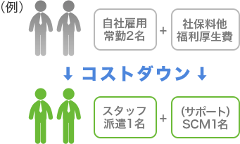 自社スタッフを手厚く動員する安心感以上に、弊社のSCMによるサポート体制は、合理的且つ安定的に機能する現場を導きます。人事関連経費のコスト削減も可能になります。